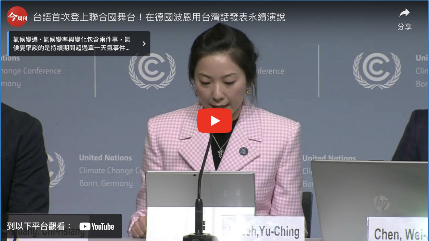 在網路上看到一部影片,是台語首次登上聯合國舞台,在德國波恩用台語發表永續演說。(United Nations Climate Change Conference, Bonn, Germany)